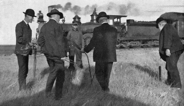 This is picture from 1904. Steam engines need water and these gentlemen are looking to find it.